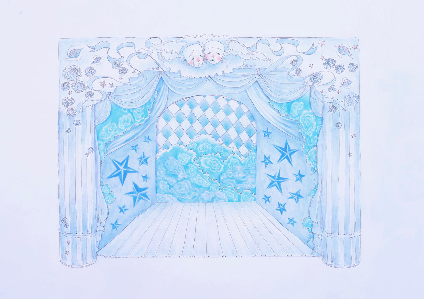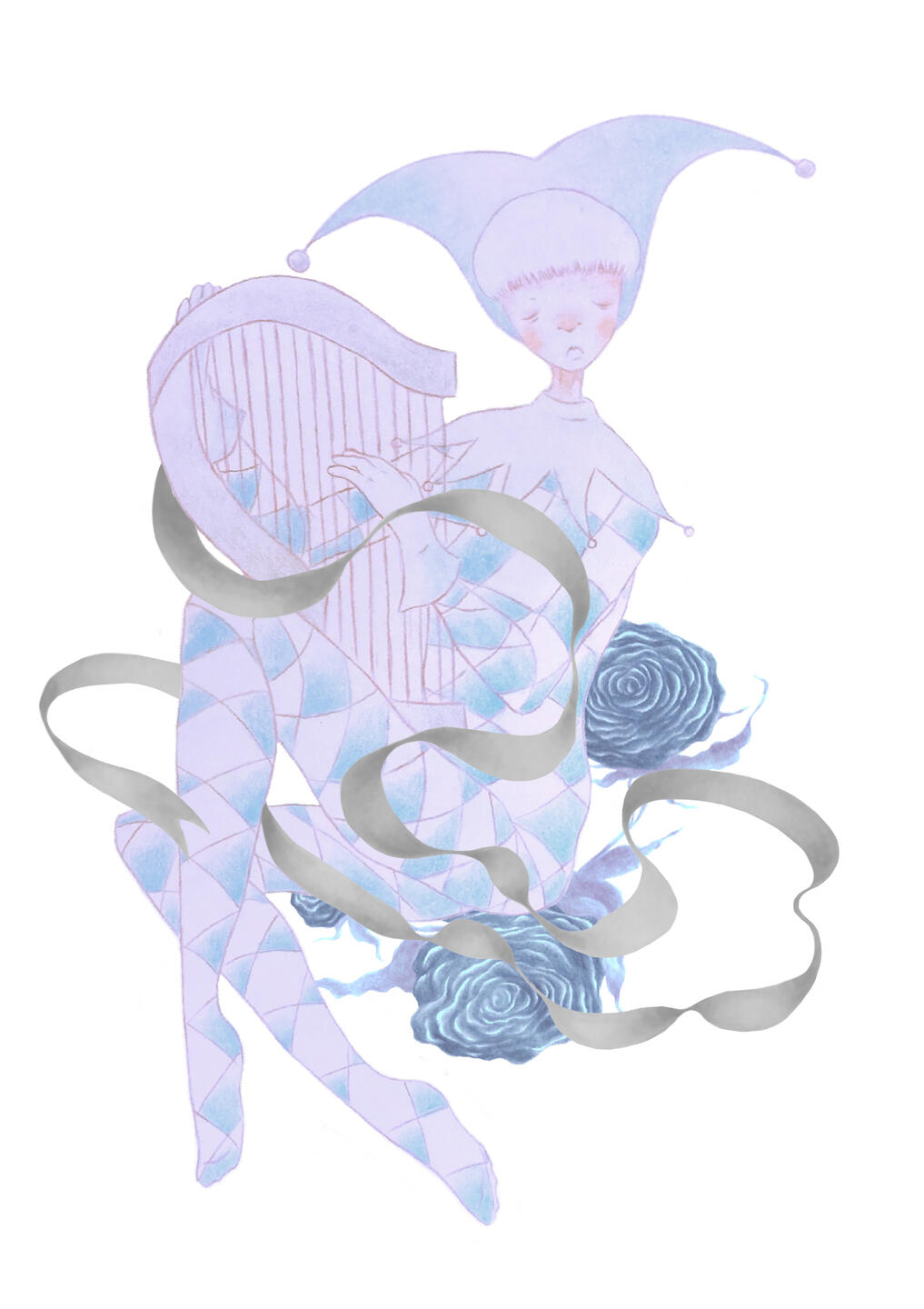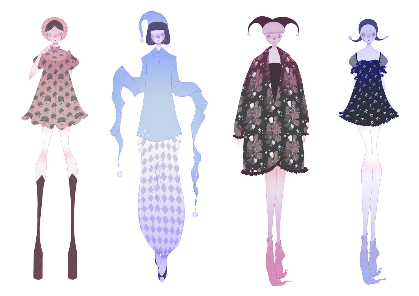 dream theatrethis project is a response to a brief set by luxury fashion brand Preen and aims to portray the intrigue and mystery surrounding traditional venetian theatre as well as the idea of a romantic tragedy, underlying melancholic emotions concealed under a mask, quite literally. i chose to use key figures featured in this field of theatre such as The columbine, harlequin and pierrot who are caught in a love triangle, pierrot pining hopelessly after columbine who has eyes only for the mischievous harlequin. Due to preen’s association with the harlequin print i wanted to feature it in my work and so i took it upon myself to research where the print itself derives from and found myself very much inspired by the traditional roles within this branch of theatre. due to my colour palette of contrasting light and dark hues, almost akin to day and night, as well as the soothing shades of lilac, pink and light blue, i themed my project around sleepwear. i depicted the floral imagery often used in preen’s catalogue as flowers thrown from a satisfied audience to the performers at the end of a show.