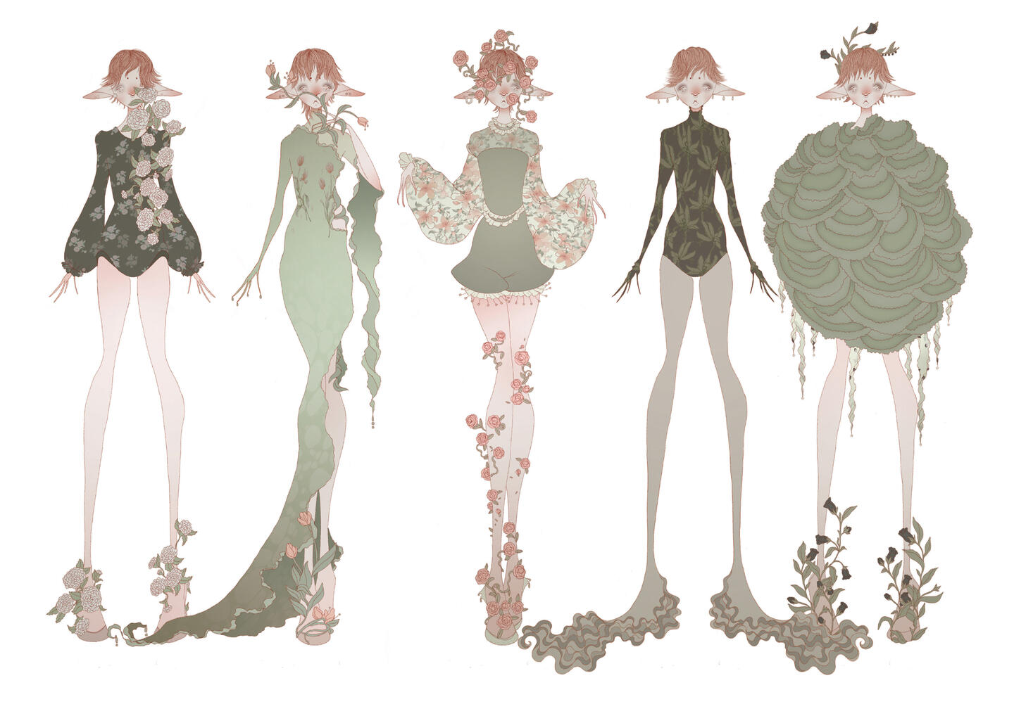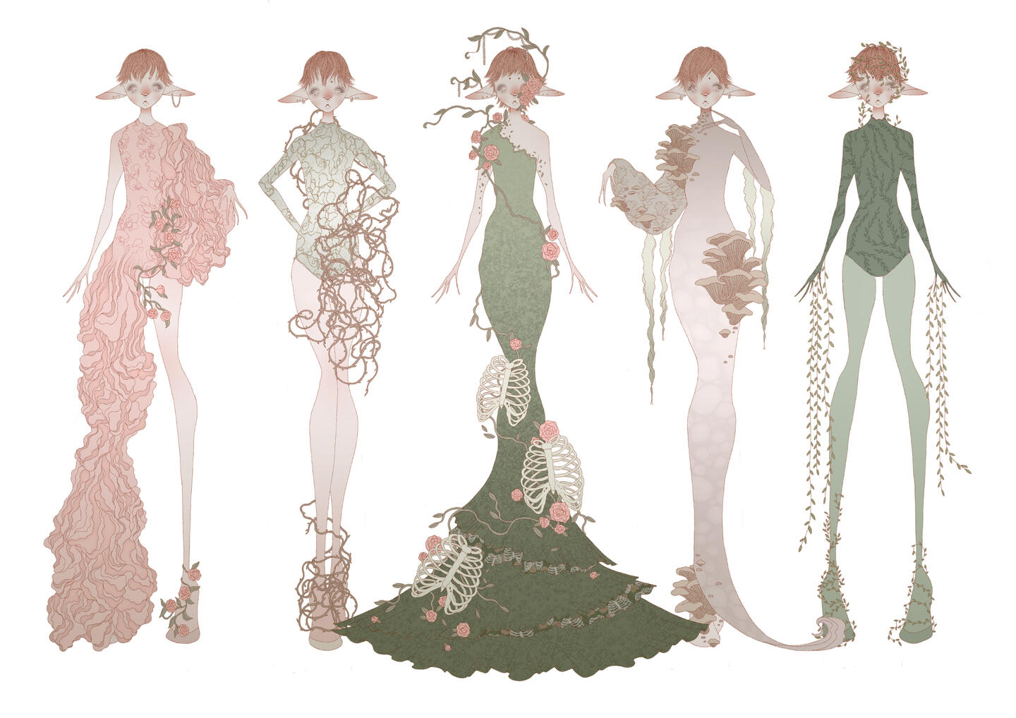 The narrative that I have created explores the concept of an elven race that is exploited by carnivorous plants. Different species of plants sprout from the hostile realm that they and the elves inhabit and attach themselves to a host, more than one plant may attach but it tends to be of the same variety. The ornate beauty of the creatures and the plants lures prey into a false sense of safety, their visually appealing colours often help to attract them. The plants then produce a chemical that affects the brain chemistry of the host, causing them to succumb to their inner carnal desires to satiate their botanical parasites. As the plants cannot move themselves, this is their means to find food and reproduce. When the hosts’ bodies have been ravaged to the point of death, they start to succumb to the surrounding environment, effectively growing into the realm itself, thus starting the cycle again when the parasites they carried are mature enough to reproduce.